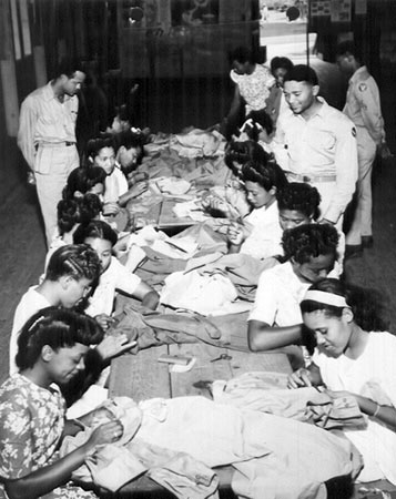 Aviation cadets study a radial aircraft engine during one of their ground school courses  June 1942 Air University/ HO, Maxwell Air Force Base AL photo collection Female students at Tuskegee Institute assist the aviation cadets by sewing patches on their uniforms. Hangar No. 1, Moton Field 1999 National Park Service May 8, 1944 From the Air Force Historical Research Agency, Maxwell Air Force Base, AL, photo collection May 8, 1944  From the Air Force Historical Research Agency, Maxwell Air Force Base, AL, photo collection